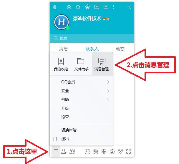 第①步点击QQ左下角菜单图标,在弹出的菜单中选“消息管理”
