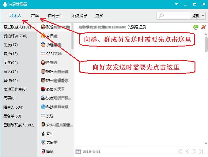 第②步:发好友时点击“联系人”,发群、群成员时点击“群聊”。
