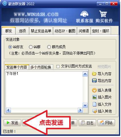 第③步: 点击群发器“发送”按钮,如果电脑上只登陆了1个QQ请直接看第5步。